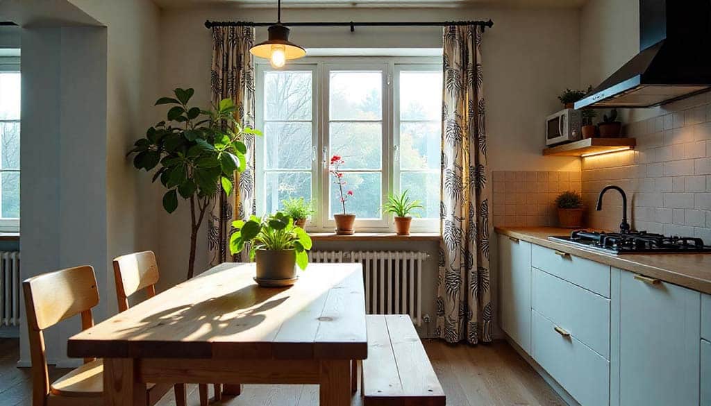 پرده، میزنهارخوری و کابینت های آشپزخانه مینیمال