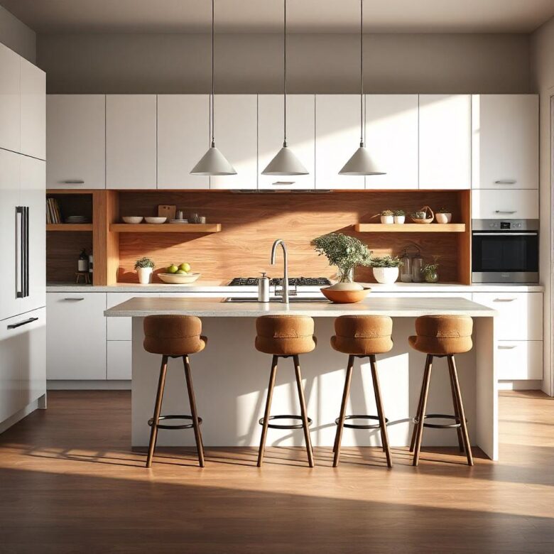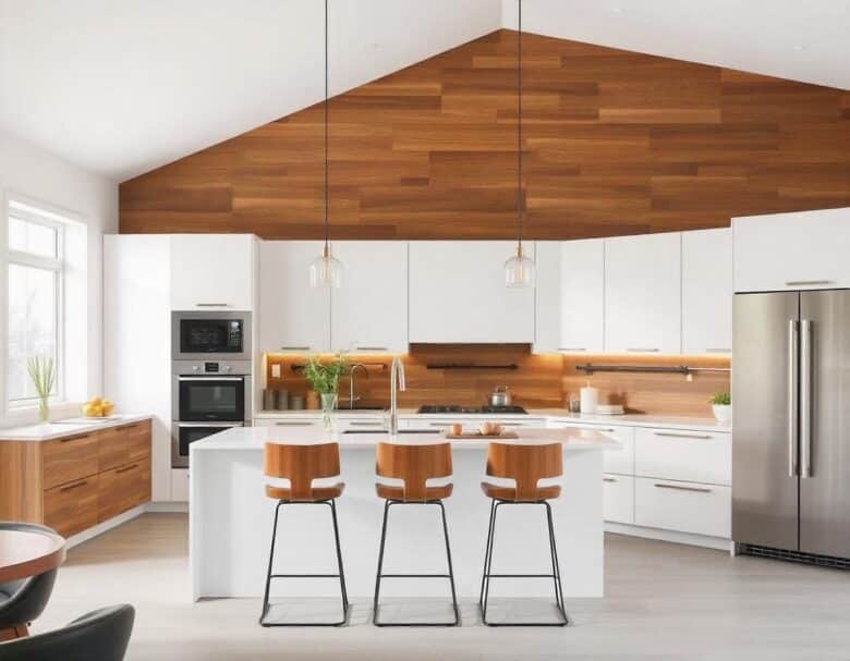 ترکیب کابینت مدرن سفید و چوب ظاهری گرم و صمیمی به آشپزخانه میبخشد. استفاده از چوب طبیعی در کنار رنگ سفید، تعادلی زیبا بین مدرنیته و طبیعت ایجاد میکند. این ترکیب برای آشپزخانههایی با سبک مدرن و اسکاندیناویایی بسیار مناسب است.