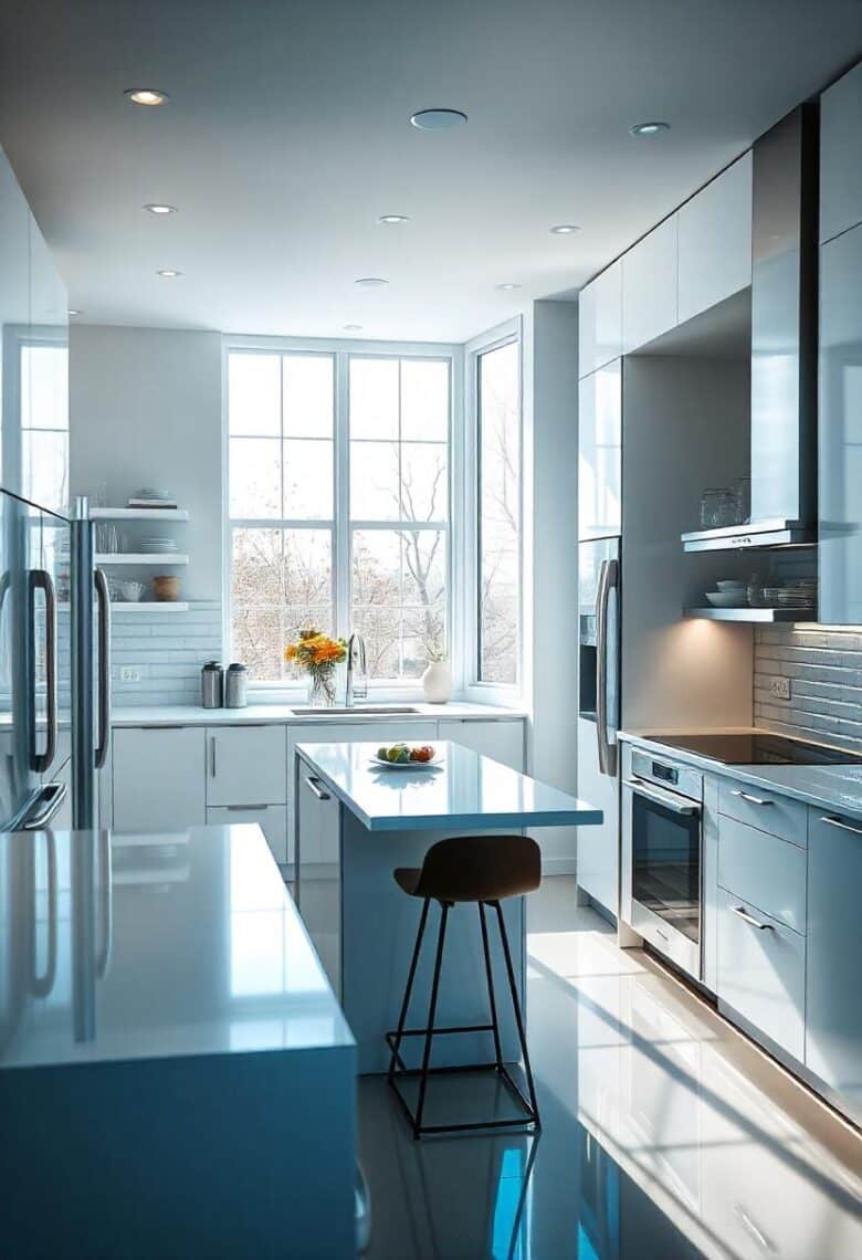 - سطوح صاف و براق: معمولاً از سطوح صاف و براق مانند هایگلاس، پلیگلاس و امدیاف استفاده میشود که ظاهری مدرن و تمیز به آشپزخانه میبخشند.