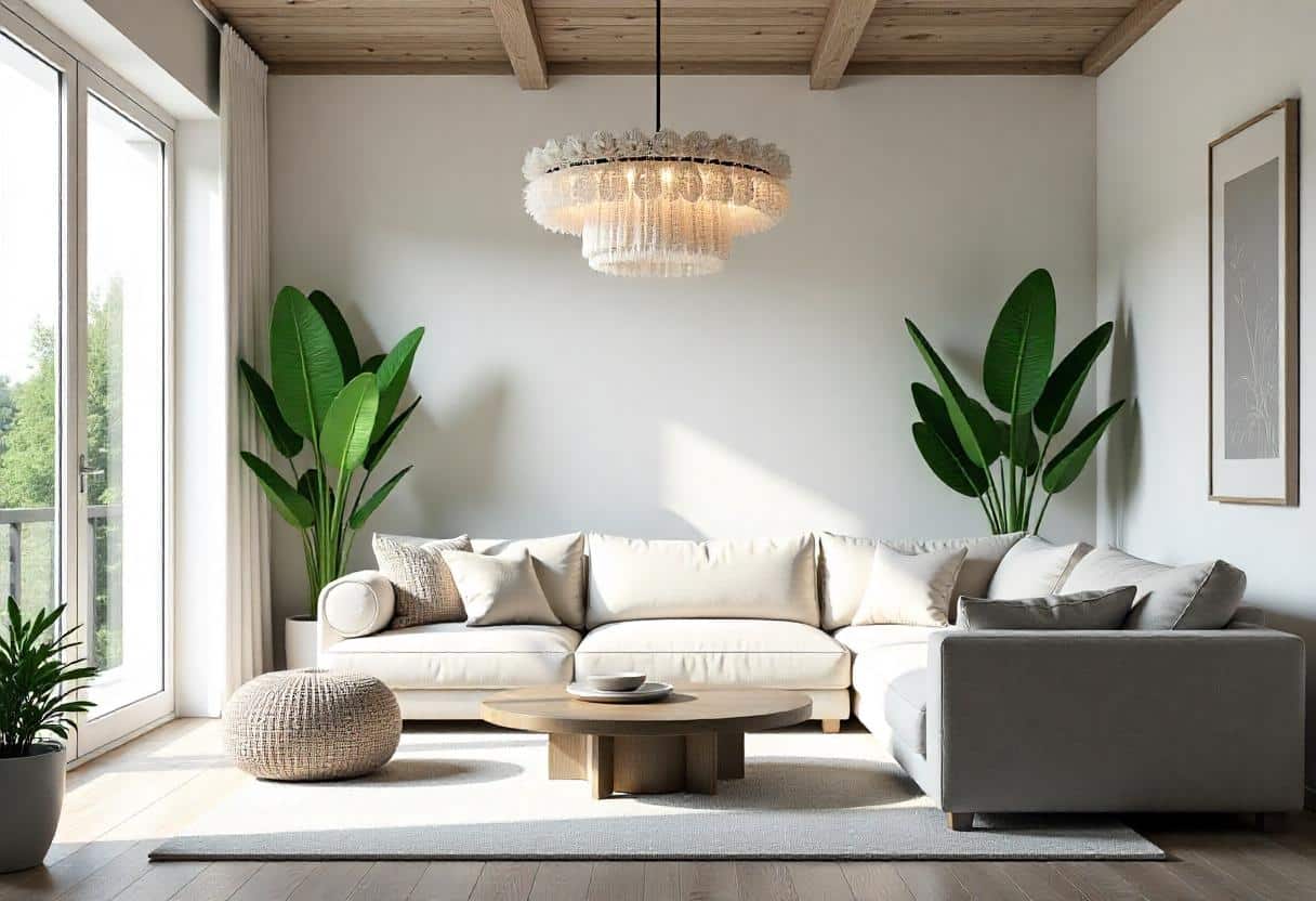 - استفاده از لوستر مدرن کریستالی در کنار پرده زبرا با رنگ خنثی: این ترکیب، فضایی لوکس و مجلس را ایجاد میکند.