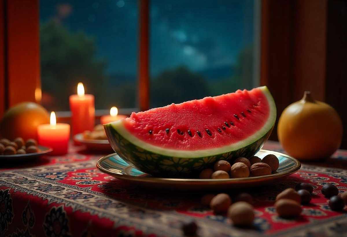 - هندوانه: این میوه سرخفام، نماد خورشید و گرمای تابستان است و به اعتقاد پیشینیان، خوردن آن در شب یلدا، سرمای زمستان را از بدن دور میکند.