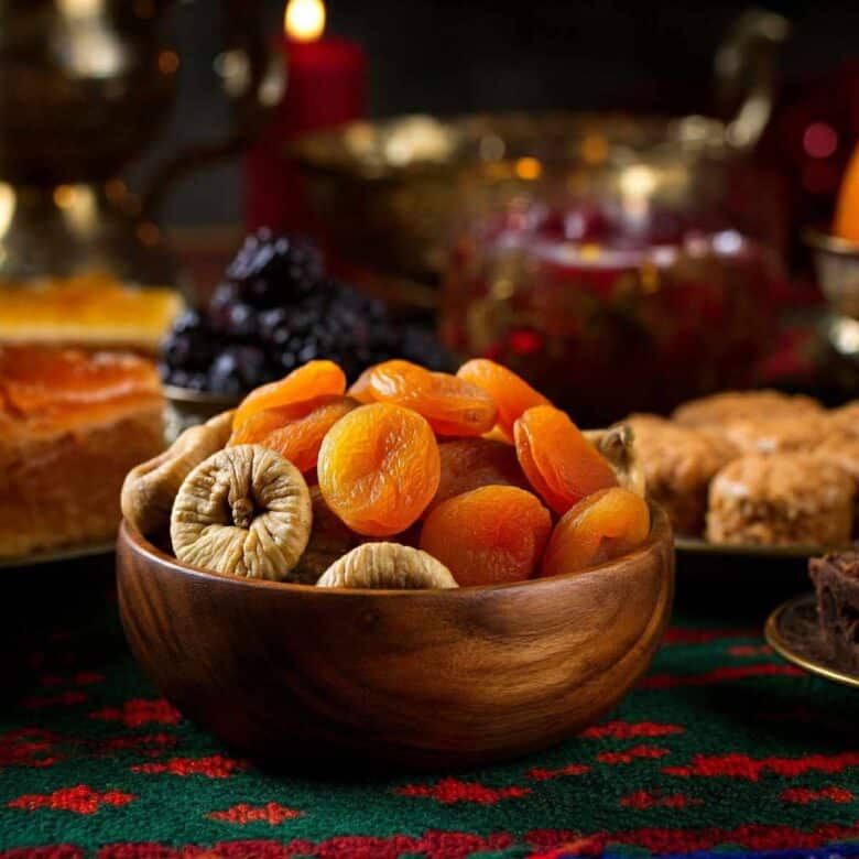 - خشکبار: برگههای خشک شده میوههایی مانند هلو، زردآلو و انجیر نیز در سفره شب چله جایگاه ویژهای دارند و به نشانه شیرینی و خوشی میل میشوند.