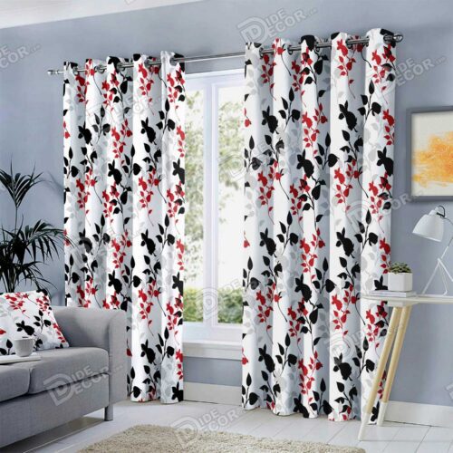 پرده پانچ کد PMP-32 چاپ شده با طرح طبیعت با زمینه ای به رنگ سفید و دارای تصویری از شاخه و برگ به رنگ مشکی و قرمز و طوسی می باشد.