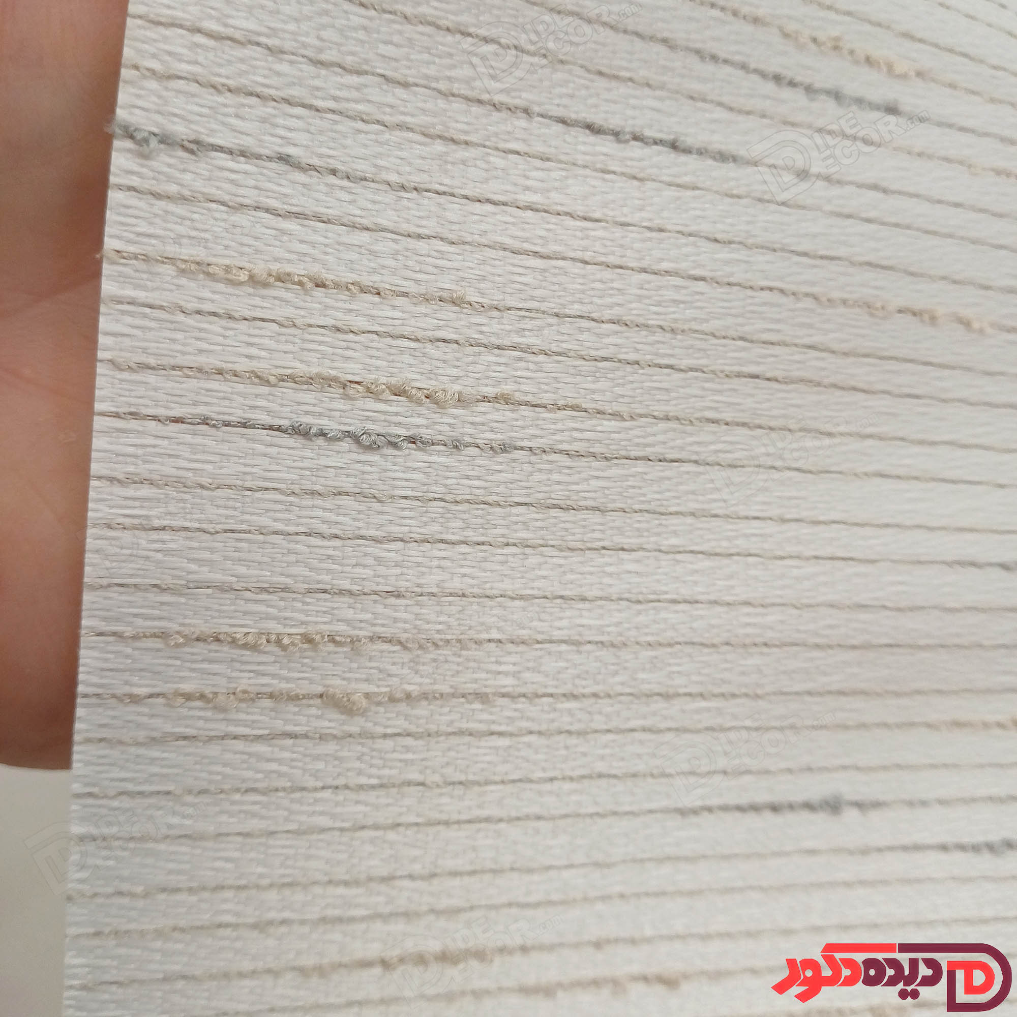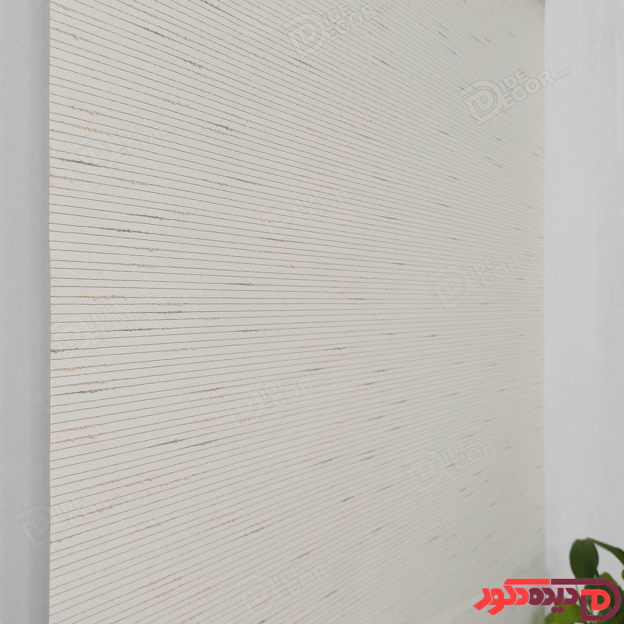 این پرده شید سفید دارای پارچهای با طرح خطوط افقی نامنظم به رنگهای کرم و طوسی است.